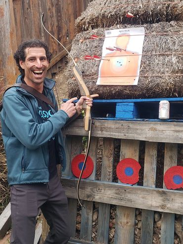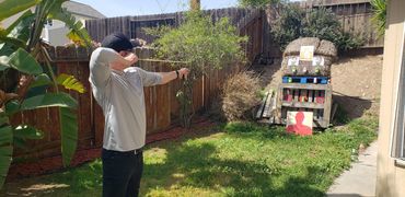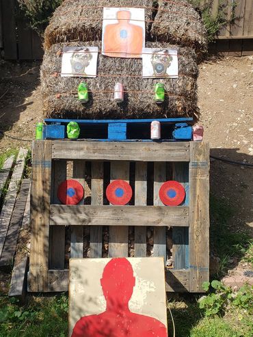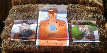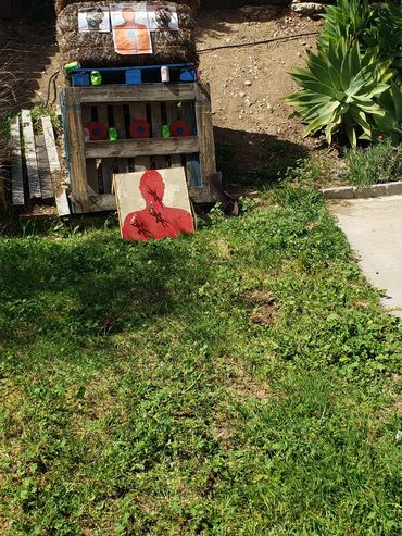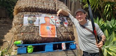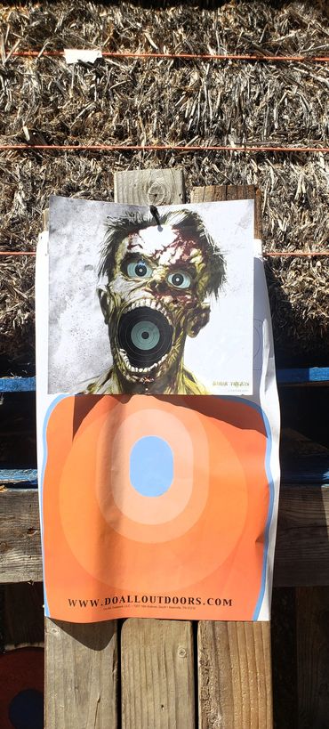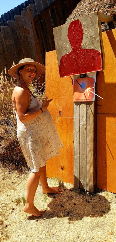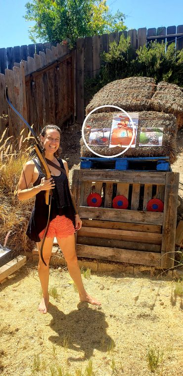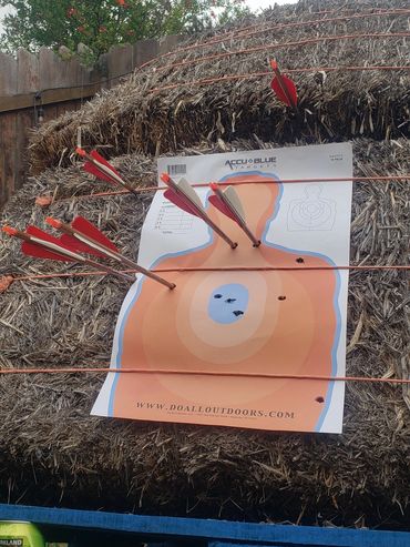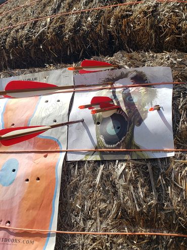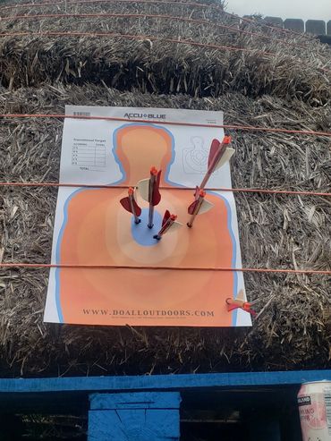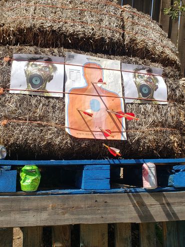 One of John's initial draws went into the fence behind the target as you can see in the picture gallery below. This is his improved draw and targeting after giving him feedback as to what adjustments to make. You can see and hear him hit the paper target which is a major correction from missing the hay bails entirely and hitting the fence above it! I share his second attempt target which is much improved just left of my target results next to it at the bottom corner.