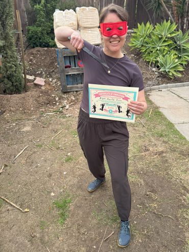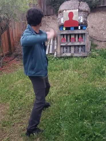 We start with the proper stance just like with most motor skills. As an Occupational Therapist, I am experienced with breaking down the various mental and motor components of many skills (visual motor, gross motor and fine motor individual and combined). So first I taught him how to throw a baseball throw properly which he demonstrated well here. His visual motor skills improved from holding onto it too long to hit the ground to release and hit the actual target in the red which is huge progress! But then we had to move from the gross motor movements of the larger muscle groups down to the fine motor components to get him to have the shuriken stick when it hit the target.